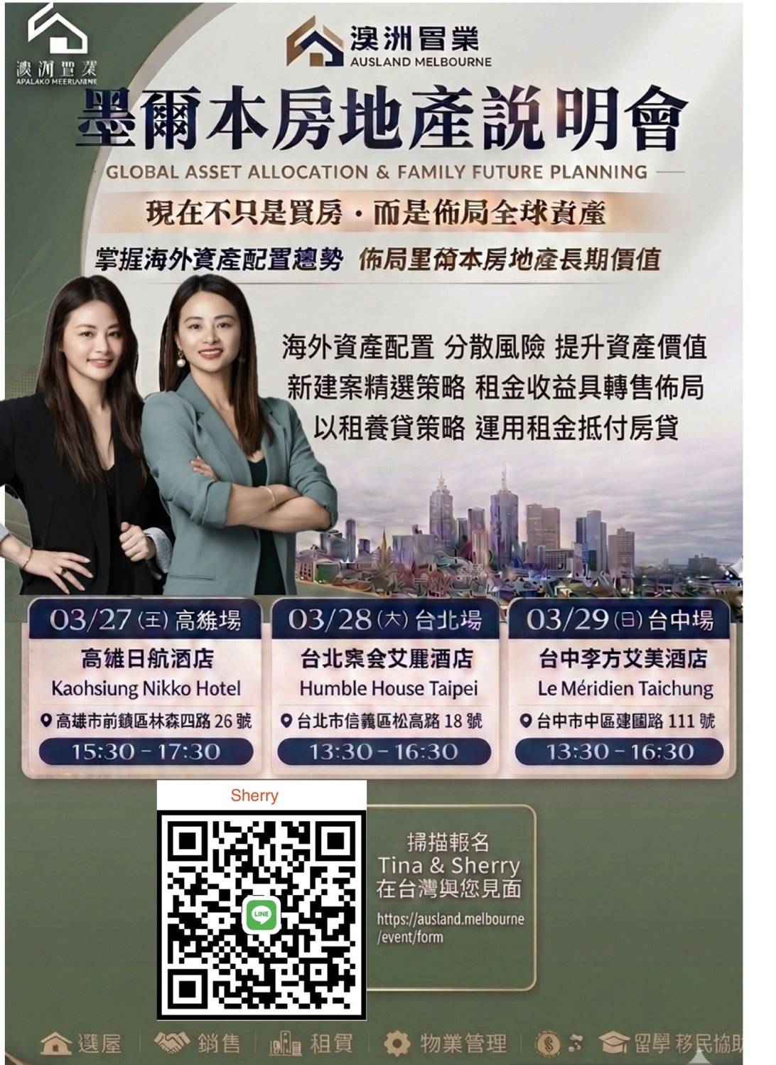隨著全球資產配置趨勢升溫,澳洲墨爾本憑藉穩定的經濟環境、透明的法規制度與持續成長的租賃市場,已成為亞太高資產家庭的重點配置城市。本場說明會特別邀請澳洲置業 Ausland Melbourne 的資深顧問 Tina & Sherry 親臨台灣,分享第一手的墨爾本房產趨勢與實戰策略。